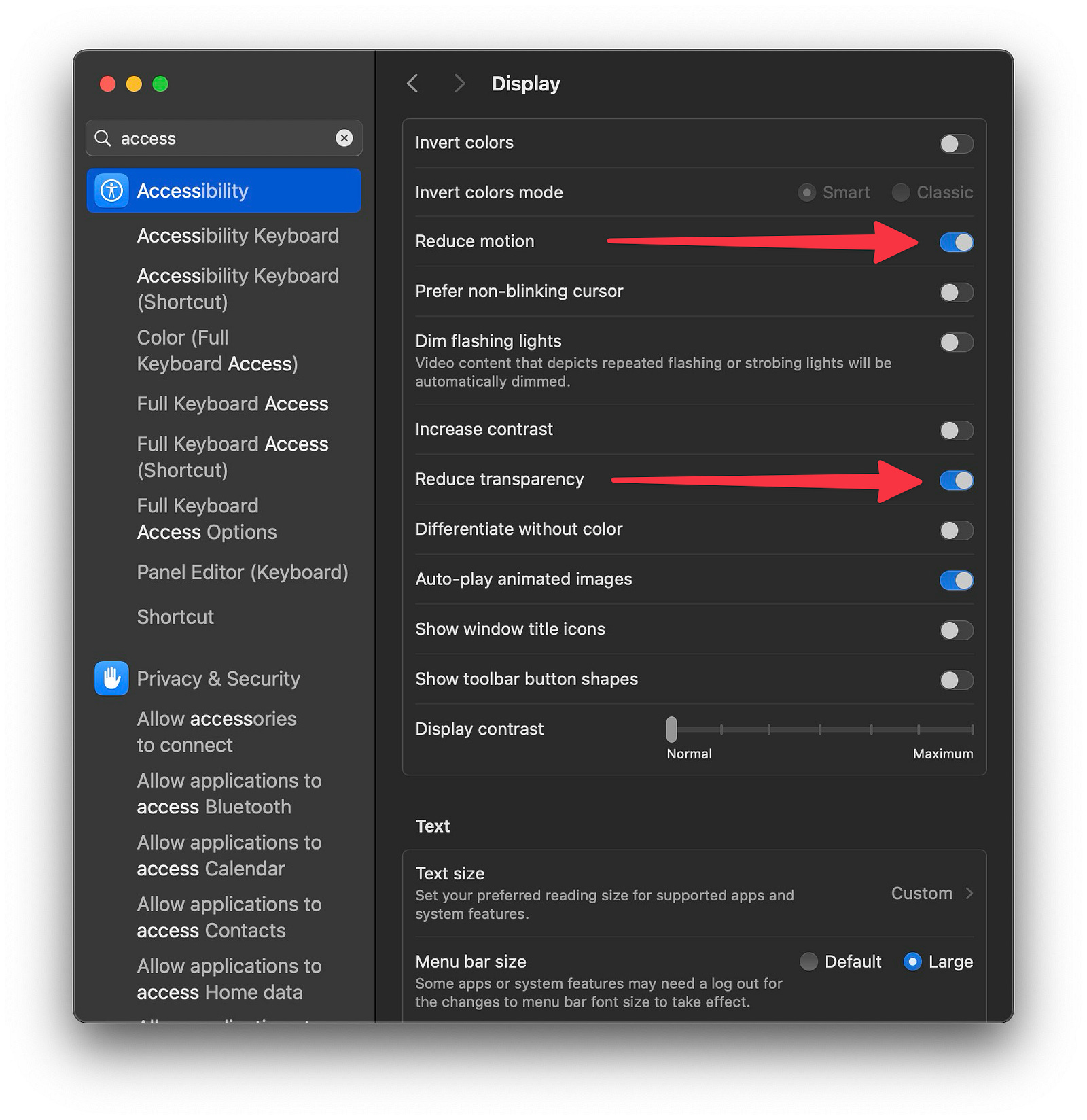 Go to System Settings → Accessibility → Display and enable “Reduce motion” and “Reduce transparency.” Your Mac will feel instantly snappier.