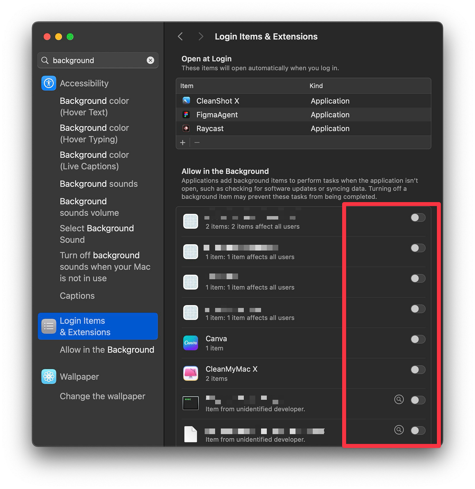 The solution: Head to System Settings → General → Login Items & Extensions→ Background Items. Review the list and disable anything that isn’t essential.