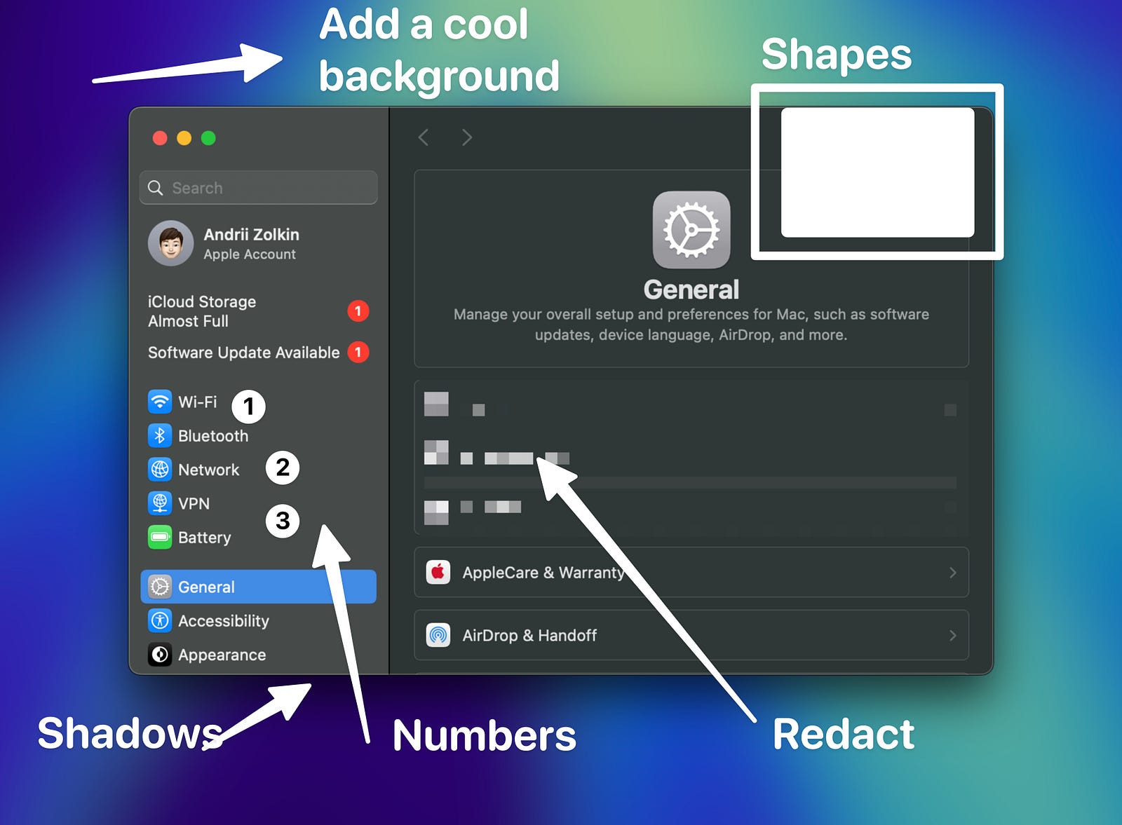 It has features to create, combine, add shadows, corners, many beautiful custom backgrounds, redact sensitive data, and annotate in many other ways. Almost all of the screenshots you see in my articles are done with this app.